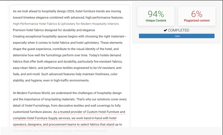 At Modern Furniture World, we understand the challenges of hospitality design and the importance of long-lasting materials. That’s why our solutions cover every detail of Hotel Furnishings, from decorative textiles and wall coverings to fully customized furniture pieces. As a trusted provider of Custom Hotel Furniture and complete Hotel Furniture Supply services, we work hand-in-hand with hotel operators, designers, and procurement teams to select fabrics that stand up to wear, sunlight, and intensive daily cleaning—without sacrificing style.